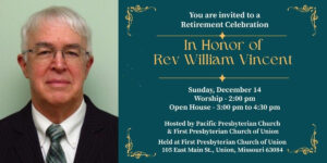 Pastor Bill Vincent Retirement Celebration December 14, 2025 2:00 pm – 4:30 pm (2:00 pm service, reception 3:00pm -4:30pm) First Presbyterian Church 105 E Main St. Union, MO 63084 Get Directions